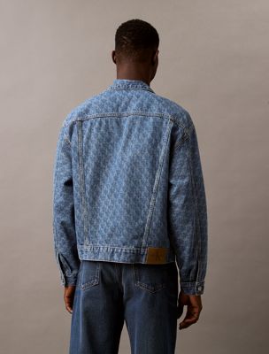 The iconic Calvin Klein monogram is printed all over this bright blue denim jacket. Featuring a 90's relaxed, boxy fit and shiny silver-toned hardware.
