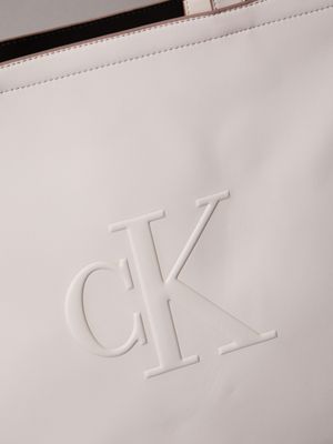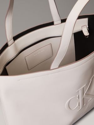 This slim tote bag features a clean, elegant design with an embossed tonal CK monogram on the front. The spacious interior includes card and slip pockets for effortless organisation.